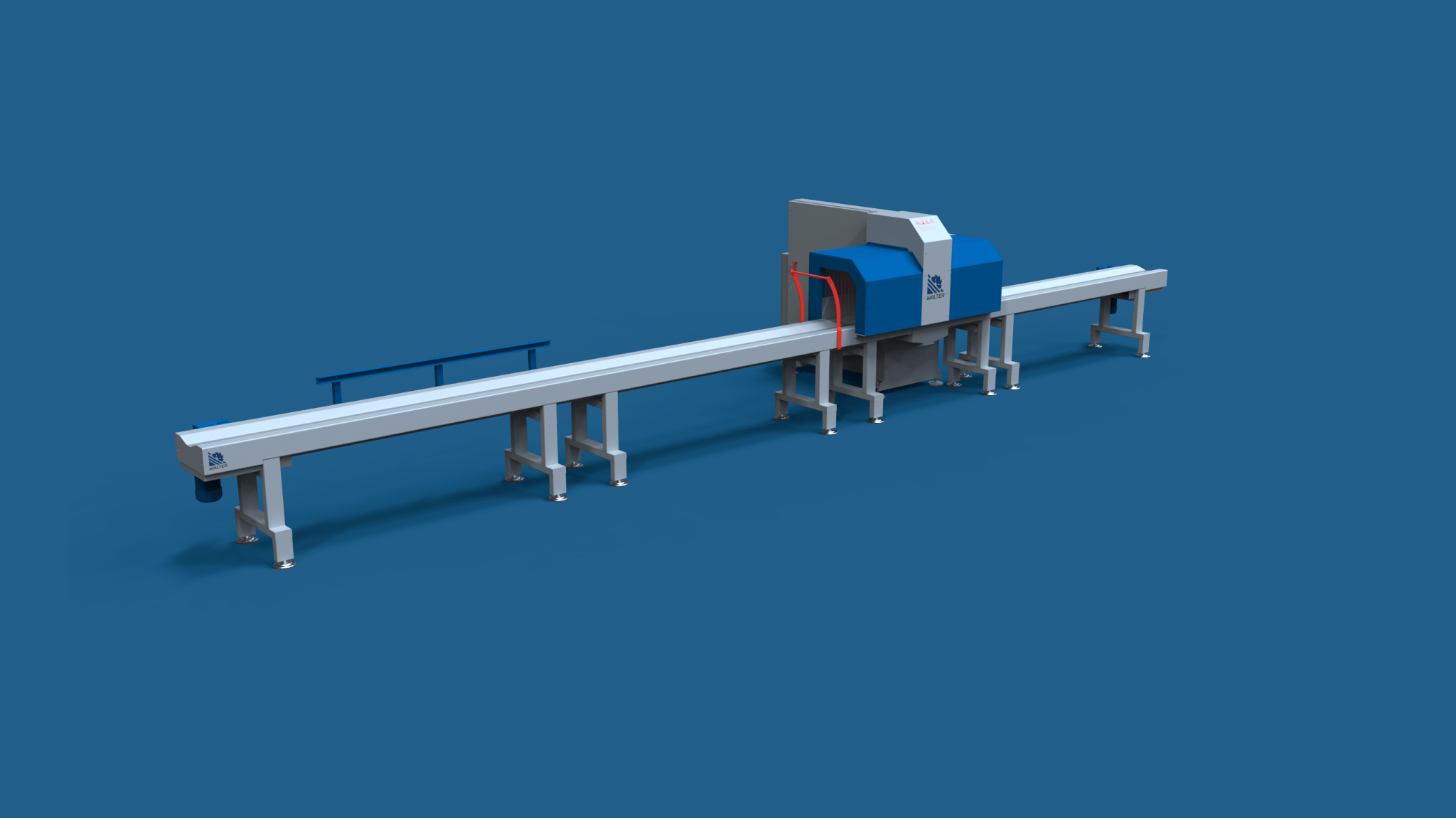 Korpus pilarki oraz zabudowa osłon uniemożliwiają kontakt operatora z narzędziem tnącym. Dostęp do piły zapewnia boczna otwierana osłona z zabezpieczeniem ryglującym, otwierana dopiero po pełnym zatrzymaniu napędu. Materiał transportowany jest w kierunku strefy cięcia za pomocą przenośnika podawczego, a podczas cięcia unieruchamiany przez dociski pneumatyczne. Po przecięciu element trafia na transporter odbiorczy.
