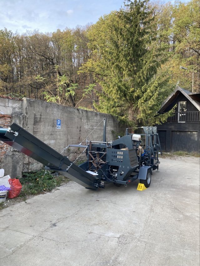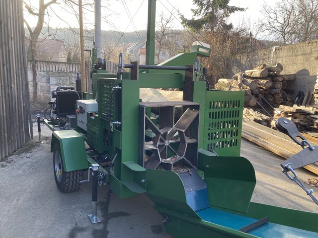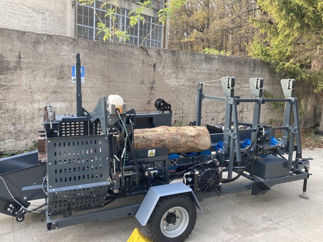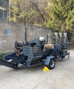 Piło-łuparka SSP-60 w wersji przejezdnej to wydajne urządzenie przeznaczone do przygotowania drewna opałowego i kominkowego w dużych ilościach. Maszyna automatycznie podaje kłodę pod piłę, tnie ją na zadany wymiar, a następnie przepycha klocek do komory łupania, gdzie następuje rozłupanie na określoną liczbę polan — w zależności od użytego noża (8, 12 lub 16 części). Dzięki temu SSP-60 znacząco przyspiesza proces przygotowania drewna, zwiększając efektywność pracy i komfort operatora.