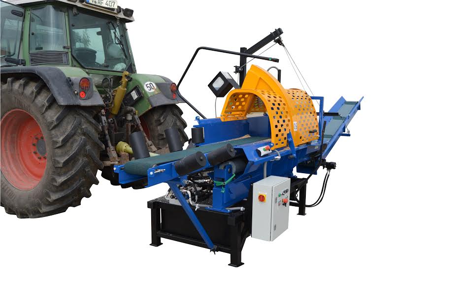 Piło-łuparka SSP42-EP to półautomatyczna maszyna przeznaczona do szybkiego i efektywnego przygotowania drewna opałowego oraz kominkowego. Urządzenie łączy w jednym cyklu cięcie drewna piłą łańcuchową, jego łupanie oraz transport gotowych polan za pomocą taśmociągu. Dodatkowym usprawnieniem pracy jest automatyczne podawanie drewna taśmą pod piłę, co znacząco zwiększa wydajność procesu.